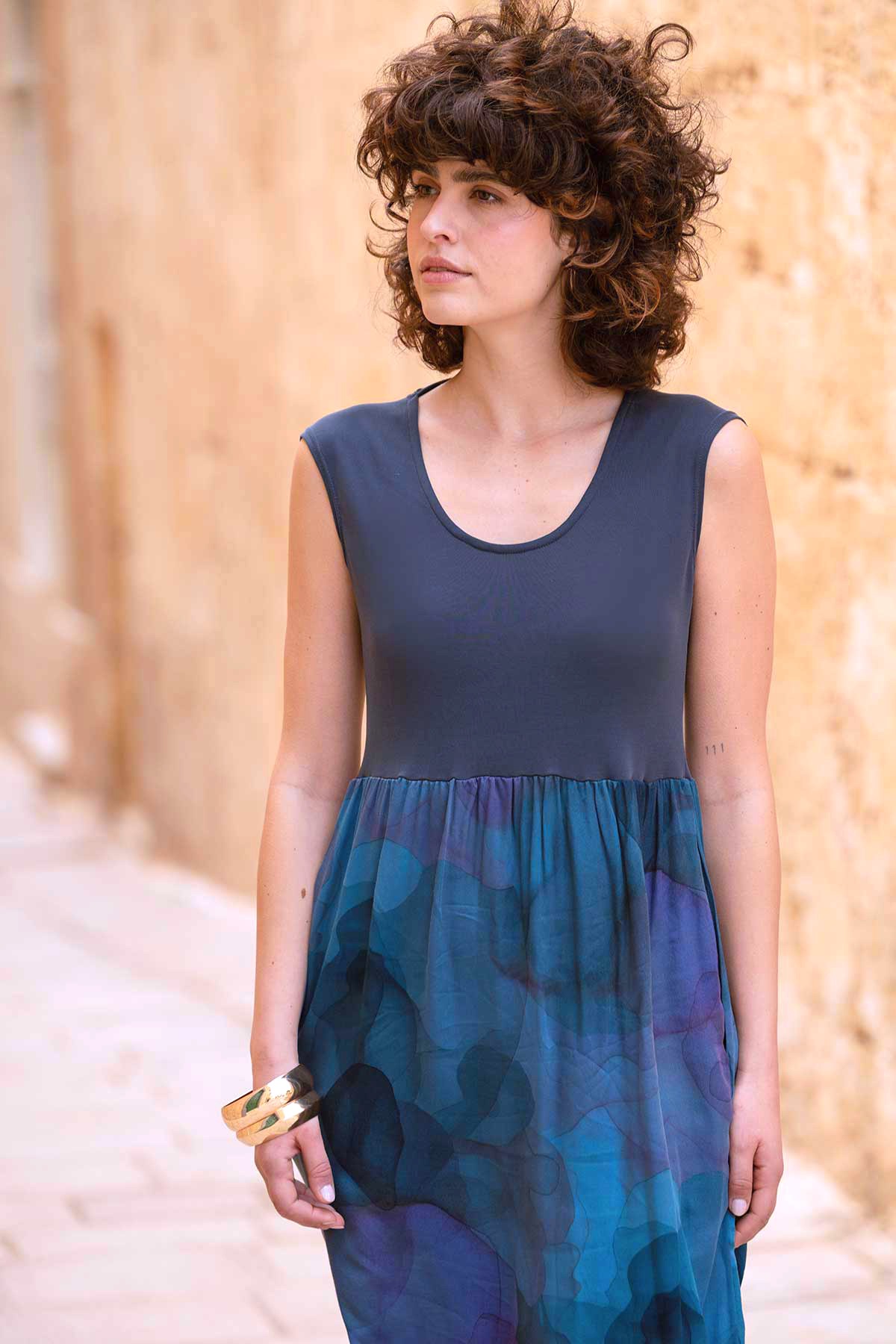 Der Rockteil besteht aus einer leichten ECOVERO® Webware, die beim Gehen locker mitschwingt und dem Kleid seine luftige Silhouette verleiht. Der Schnitt fällt entspannt bis etwa zur Wade und macht MIXMA zu einem perfekten Sommerkleid für Alltag, Büro oder Urlaub.
