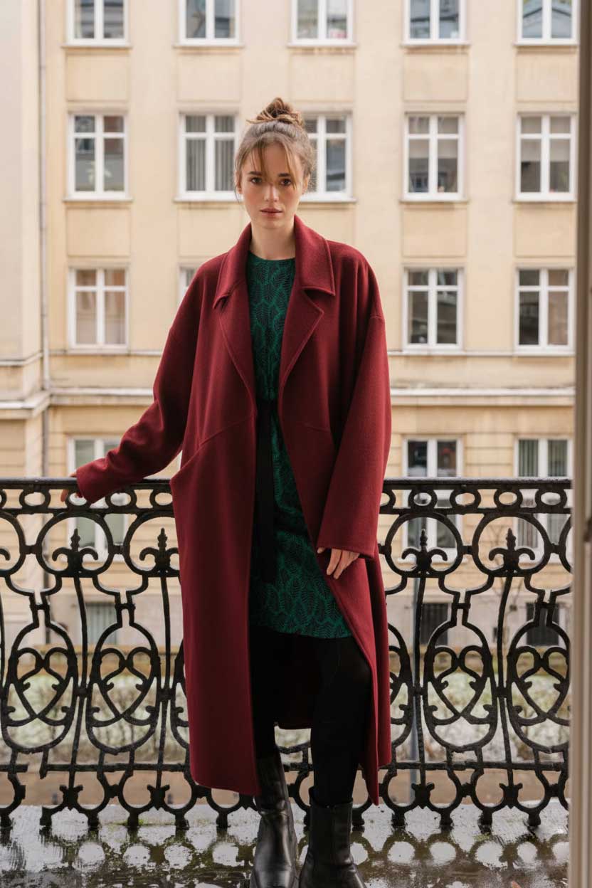 Der beerige Farbton macht den Mantel zu einem Statement-Piece: lässig kombiniert mit Jeans und Boots, oder elegant getragen über einem schlichten Kleid – ein Mantel, der vielseitig bleibt und Deine Garderobe aufwertet.