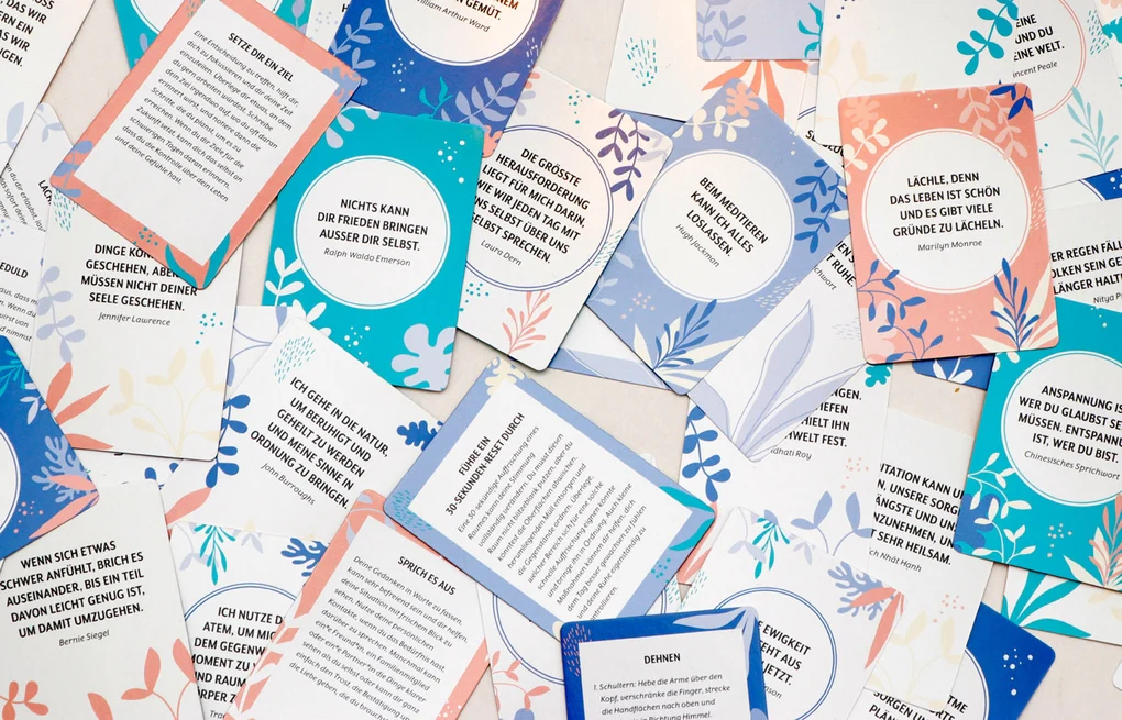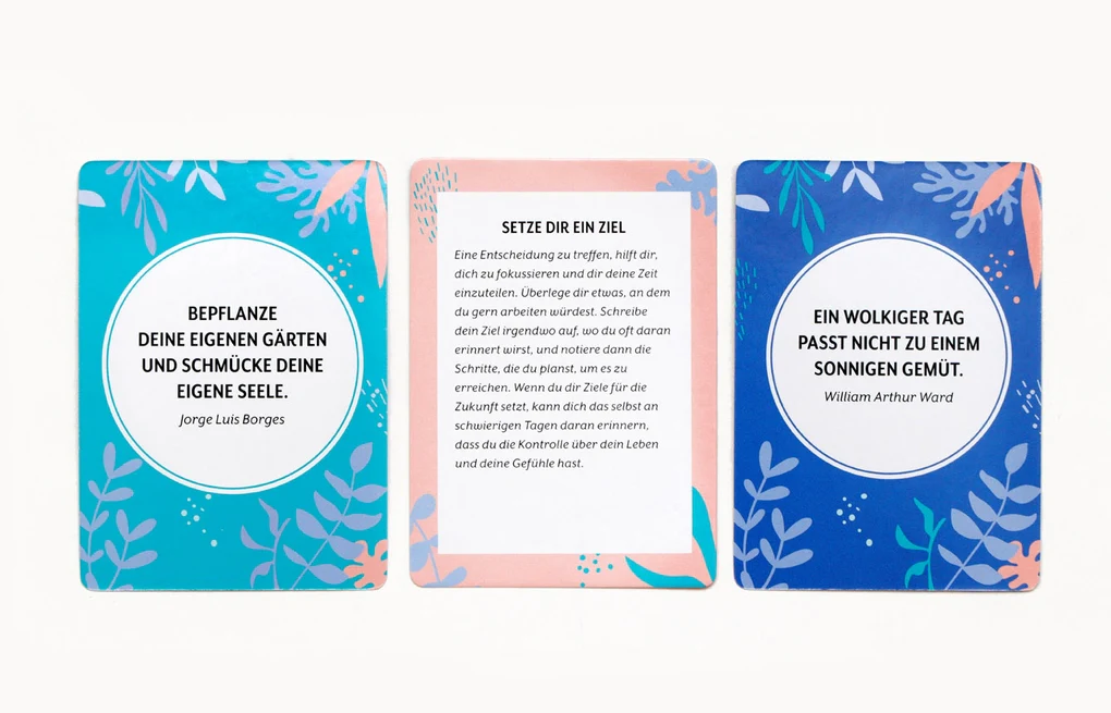 Du kommst nach Hause, der Tag war voll. Während du die Jacke ablegst, greifst du zur Box und ziehst eine Karte. Ein kurzer Satz – sanft, aber kraftvoll. Du setzt dich ans Fenster, liest ihn ein zweites Mal. Plötzlich wird der Tag ein bisschen weiter, dein Atem tiefer. Später erzählst du deinem Kind oder Partner, wie dieser kleine Moment dir gutgetan hat.